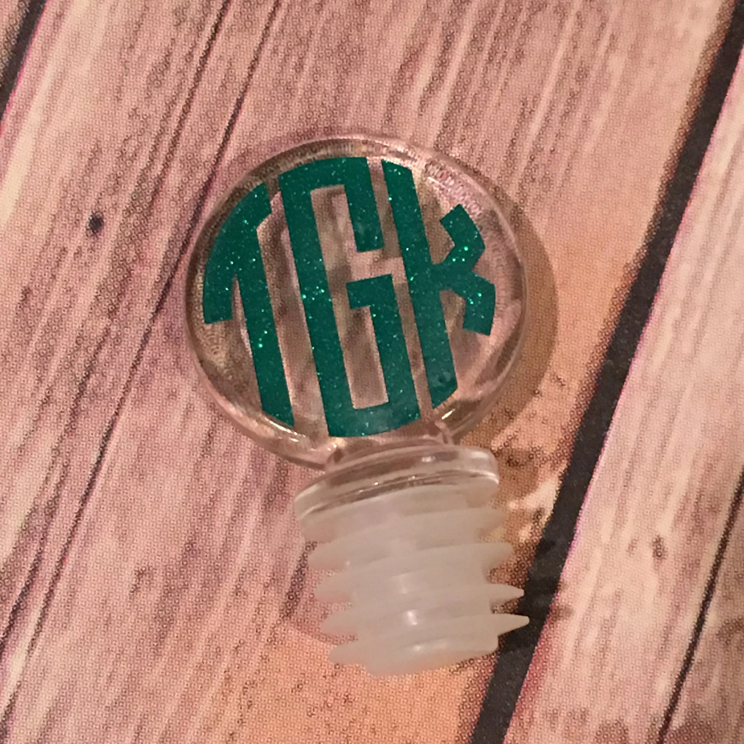 This fun acylic wine stopper is customized with a vinyl decal. These look great with glitter monograms!