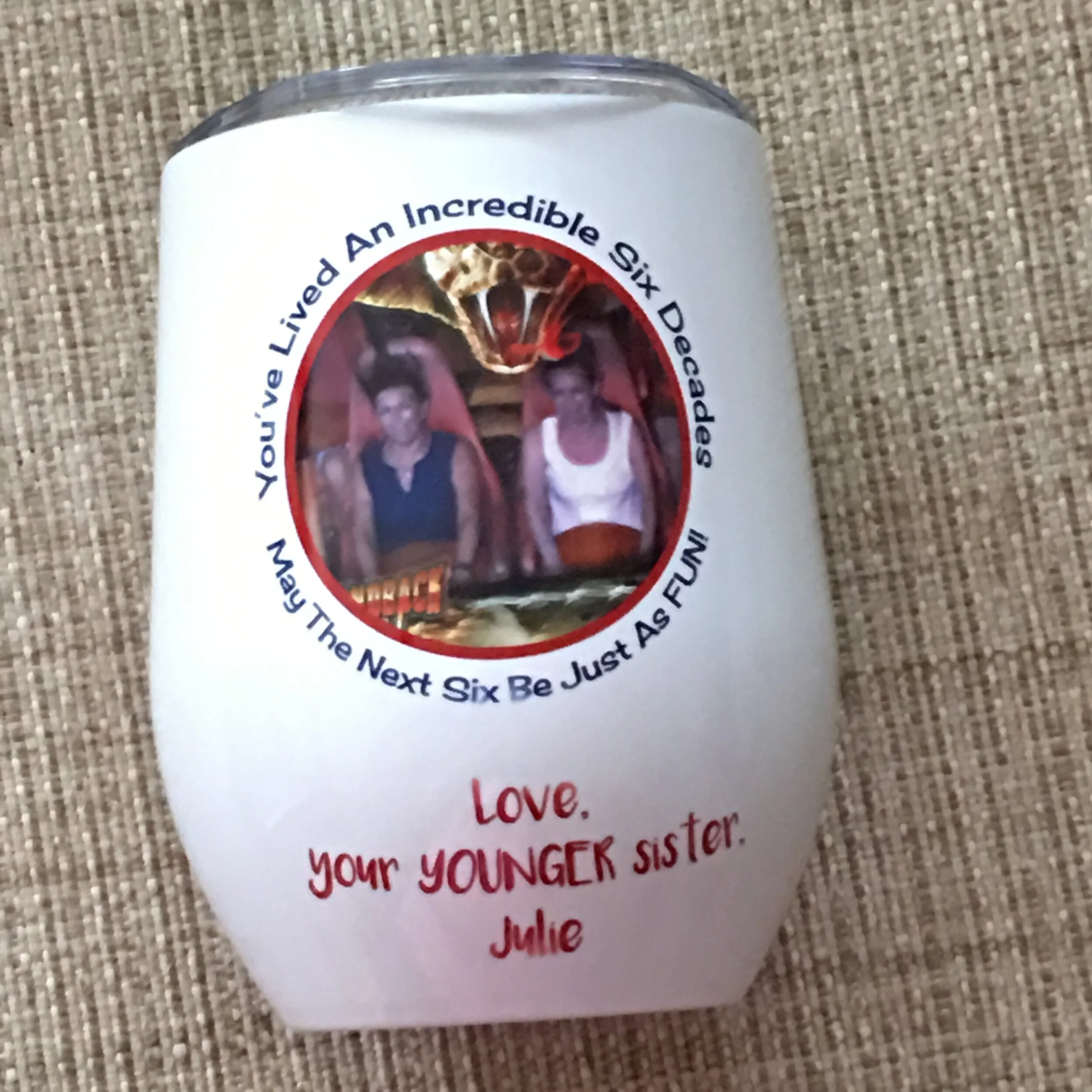 Customize these white wine tumblers with a fun graphic, silly phrase or images. The design is printed into the surface so it’s a permanent addition to the tumbler.